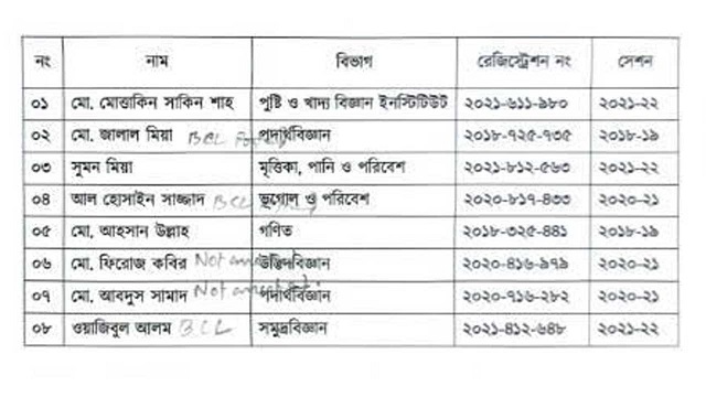 সাময়িক বহিষ্কৃত ও সিট বাতিল হওয়া শিক্ষার্থীরা হলেন- পুষ্টি ও খাদ্য বিজ্ঞান ইনস্টিটিউটের মো. মোত্তাকিন সাকিন শাহ, পদার্থবিজ্ঞান বিভাগের জালাল মিয়া, মৃত্তিকা পানি ও পরিবেশ বিভাগের সুমন মিয়া, ভূগোল ও পরিবেশ বিভাগের আল হোসাইন সাজ্জাদ, গণিত বিভাগের আহসান উল্লাহ, সমুদ্রবিজ্ঞান বিভাগের ওয়াজিবুল আলম, উদ্ভিদবিজ্ঞান বিভাগের ফিরোজ কবির ও পদার্থবিজ্ঞান বিভাগের আবদুস সামাদ।
