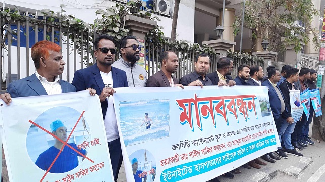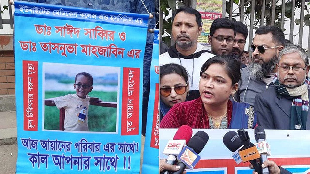 ইউনাইটেড মেডিকেল কলেজ হাসপাতালে সুন্নতে খৎনা করাতে গিয়ে শিশু আয়ানের মৃত্যুর ঘটনায় অভিযুক্ত চিকিৎসক ডা. সাঈদ সাব্বির ও ডা. তাসনুভা মাহজাবিনের আটকসহ ৬ দফা দাবিতে স্বাস্থ্য অধিদপ্তরের গেটে মানববন্ধন করছে শিশুটির পরিবার ও স্বজনরা।