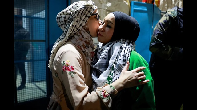 ইসরায়েলি কারাগার থেকে মুক্তির পর আবেগাল্পুত ফিলিস্তিনি বন্দী। ছবি: রয়টার্স