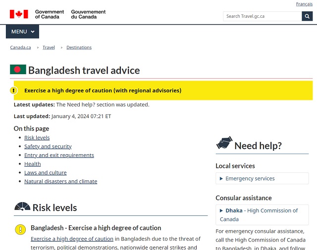 বাংলাদেশে ভ্রমণের ক্ষেত্রে নিজ নাগরিকদের উচ্চ সতর্কতা অবলম্বনের পরামর্শ দিয়েছে কানাডা। বৃহস্পতিবার (৪ জানুয়ারি) দেশটির সরকারি ওয়েবসাইটে এ পরামর্শ দেওয়া হয়েছে।