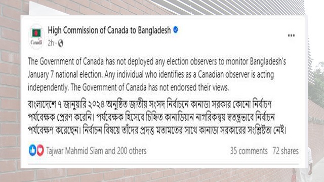 বিবৃতিতে হাইকমিশন বলেছে, ‘বাংলাদেশে ৭ জানুয়ারি ২০২৪ অনুষ্ঠিত জাতীয় সংসদ নির্বাচনে কানাডা সরকার কোনো নির্বাচণ পর্যবেক্ষক প্রেরণ করেনি। পর্যবেক্ষক হিসেবে চিহ্নিত কানাডিয়ান নাগরিকদ্বয় স্বতন্ত্রভাবে নির্বাচন পর্যবেক্ষণ করেছেন। নির্বাচন বিষয়ে তাদের প্রদত্ত মতামতের সঙ্গে কানাডা সরকারের সংশ্লিষ্টতা নেই।’