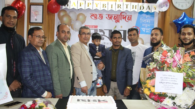 দৈনিক সময়ের প্রকাশক জেহাদ হোসেন চৌধুরীকে সাথে নিয়ে কেক কাটেন ঢাকা রিপোর্টার্স ইউনিটির (ডিআরইউ) সাধারণ সম্পাদক মাইনূল হাসান সোহেল।