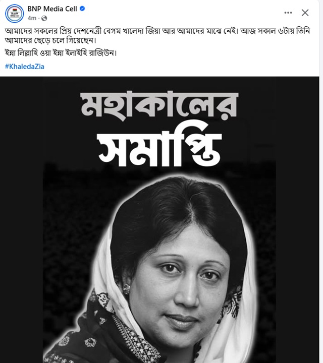 অন্যদিকে, বিএনপির ভেরিফায়েড ফেসবুক পেজে এক পোস্টে বলা হয়েছে, ‘বিএনপি চেয়ারপারসন ও সাবেক প্রধানমন্ত্রী দেশনেত্রী বেগম খালেদা জিয়া আজ সকাল ৬টায় ফজরের ঠিক পরে ইন্তেকাল করেছেন। ইন্না লিল্লাহি ওয়া ইন্না ইলাইহি রাজিউন। আমরা তার রূহের মাগফিরাত কামনা করছি এবং সকলের নিকট তার বিদেহী আত্মার জন্য দোয়া চাচ্ছি।’