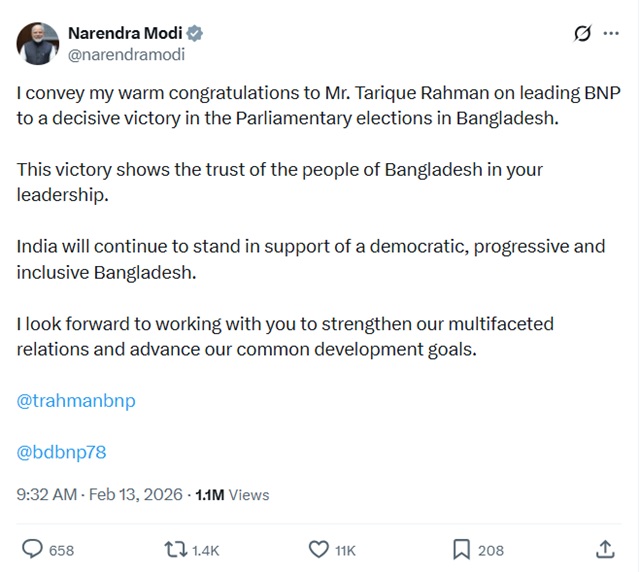 মো‌দি ব‌লেন, এই বিজয় আপনার (তা‌রেক রহমান) নেতৃত্বের প্রতি বাংলাদেশের জনগণের আস্থার পরিচয় দেয়। ভারত একটি গণতান্ত্রিক, প্রগতিশীল এবং অন্তর্ভুক্তিমূলক বাংলাদেশের সমর্থনের সঙ্গে থাক‌বে।