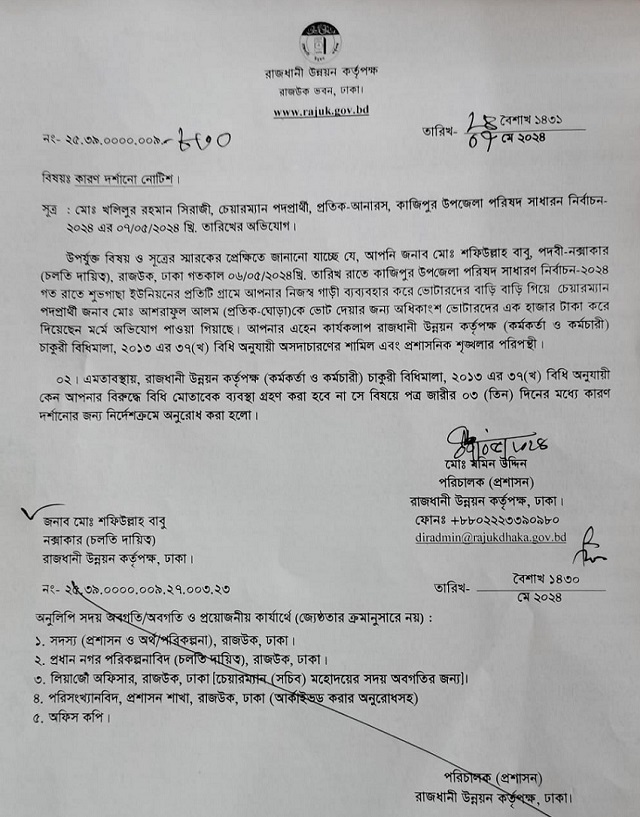 মঙ্গলবার (০৭ মে) রাজউকের পরিচালক (প্রশাসন) মমিন উদ্দিন স্বাক্ষরিত নোটিশে বলা হয়, ‘আপনি শফিউল্লাহ বাবু, নকশাকার (চলতি দায়িত্ব) রাজউক, ৬ মে রাতে কাজীপুর উপজেলা পরিষদ সাধারণ নির্বাচন-২০২৪ উপলক্ষ্যে স্থানীয় শুভগাছা ইউনিয়নের প্রতিটি গ্রামে আপনার নিজস্ব গাড়ি ব্যবহার করে ভোটারদের বাড়ি বাড়ি গিয়ে চেয়ারম্যান পদপ্রার্থী আশরাফুল আলমকে (প্রতীক ঘোড়া) কে ভোট দেওয়ার জন্য অধিকাংশ ভোটারকে এক হাজার টাকা করে দিয়েছেন মর্মে অভিযোগ পাওয়া গেছে। আপনার এহেন কার্যকলাপ রাজউক কর্মকর্তা-কর্মচারী চাকরি বিধিমালা-২০১৩-এর ৩৭(খ) বিধি অনুযায়ী অসদাচরণের শামিল এবং প্রশাসনিক শৃঙ্খলার পরিপন্থি। অতএব, বিধি অনুযায়ী আপনার বিরুদ্ধে কেন ব্যবস্থা নেওয়া হবে না, সে বিষয়ে পত্র জারির তিনদিনের মধ্যে কারণ দর্শানোর জন্য নির্দেশক্রমে অনুরোধ করা হলো।’
